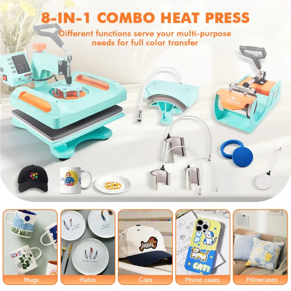 - 8-in-1 multifunction design for shirts, mugs, caps, plates, and tumblers